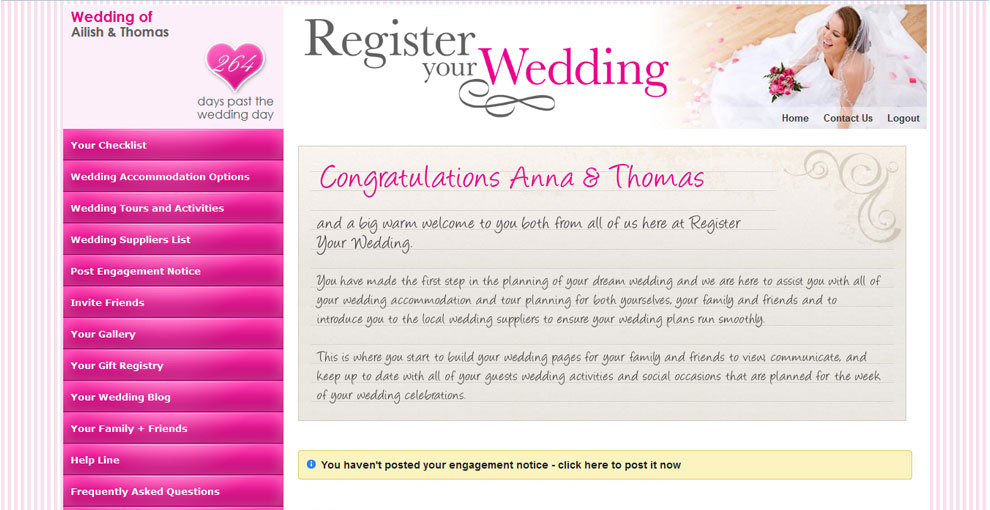 The CMS allows Register Your Wedding staff to oversee and manage the various couples who have registered and are using the website. The staff can track the bookings, manage wedding suppliers and enagement notices and a range of other features.