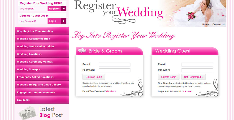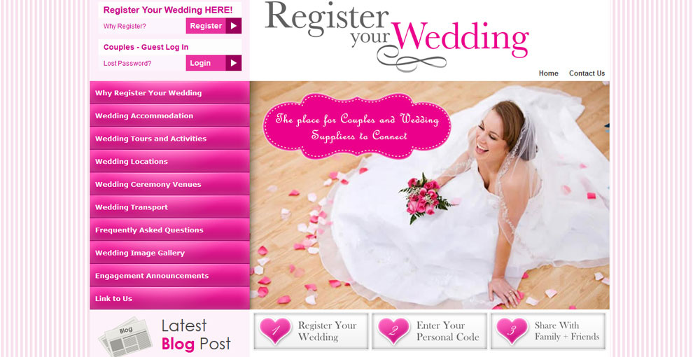 The Website Design was kept in theme with the Register Your Wedding Logo which uses Pinks of various shades and tones, complimented with Grey and White.